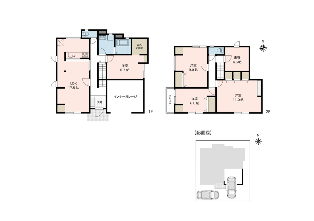 - 間取り:4LDK+書斎(4.5帖)+WIC(2.0帖)+インナーガレージ(9.0帖)