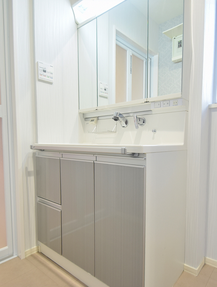 清潔感があり使い勝手の良い洗面台。引出し型で収納も楽々。