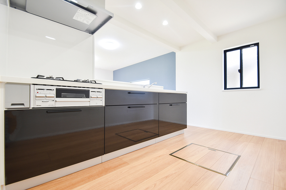 広々22.1帖のLDK。対面キッチンでリビングの様子を見ながら家事ができます。