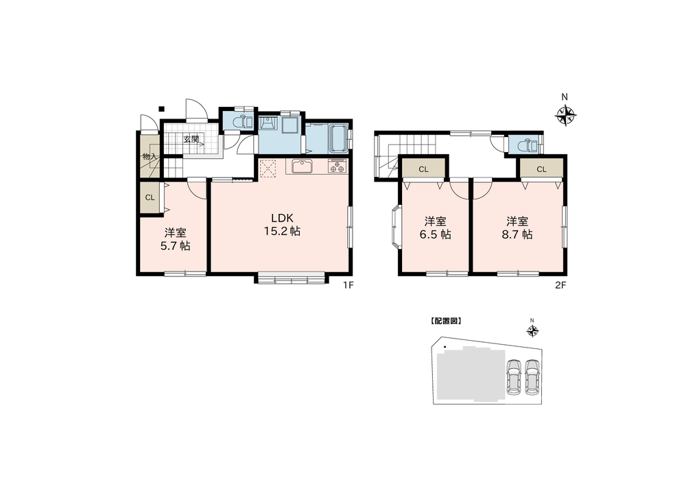 駐車スペース並列2台。全居室洋室でクローゼット付き。